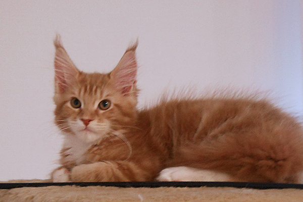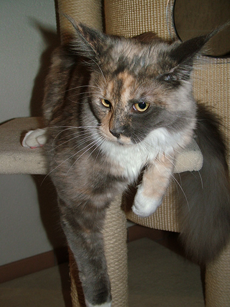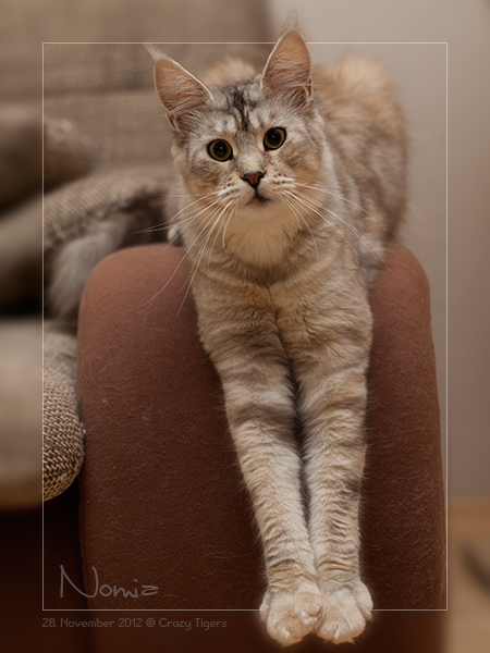 Nomia sitzt entspannt und langgestreckt in ihrer Lieblingsposition.