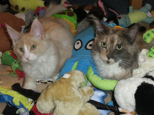 Eragon und Merlin haben schon ein Plätzchen im neuen Kratzbaum gefunden. Joanne und Nugget liegen gerne zwischen den Kuscheltieren von Sebastian.