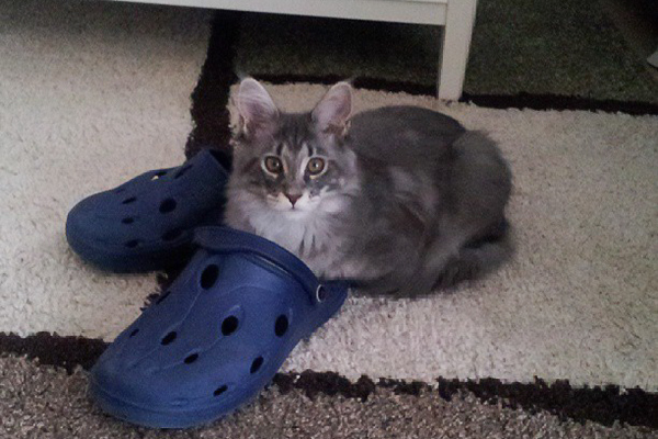Pheli bei der Crocs-Anprobe.