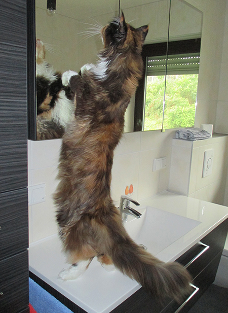 HazelNut bewundert sich im Spiegel.
