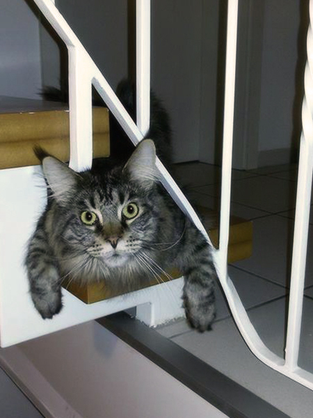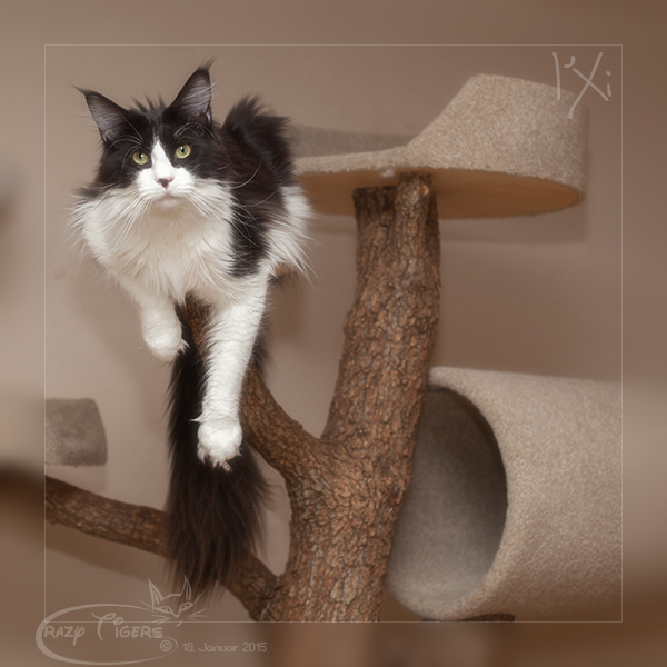 I'Xi hängt im Wohnzimmer-Kratzbaum.