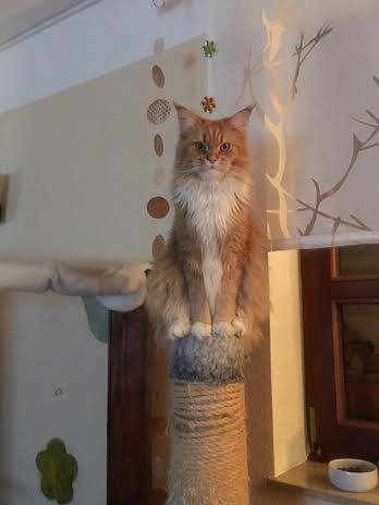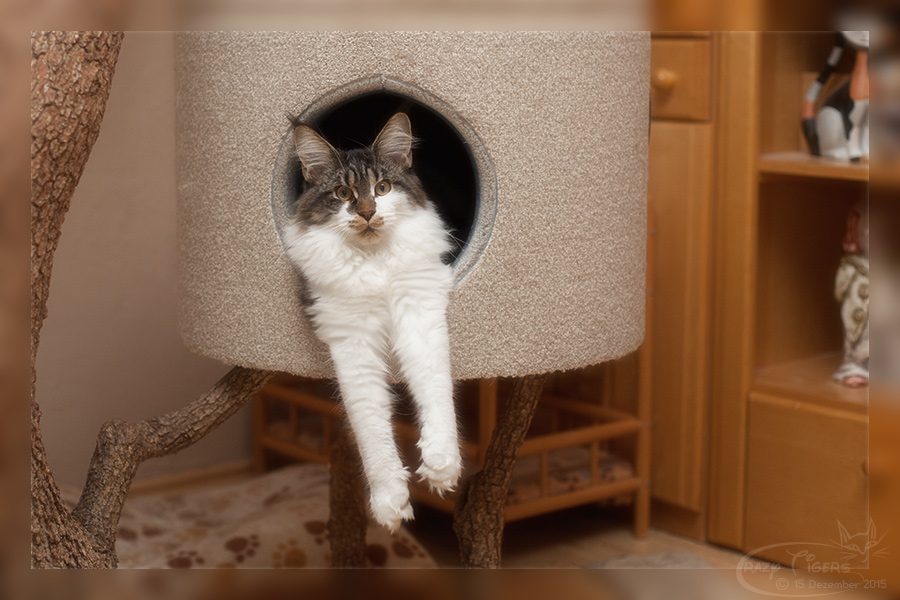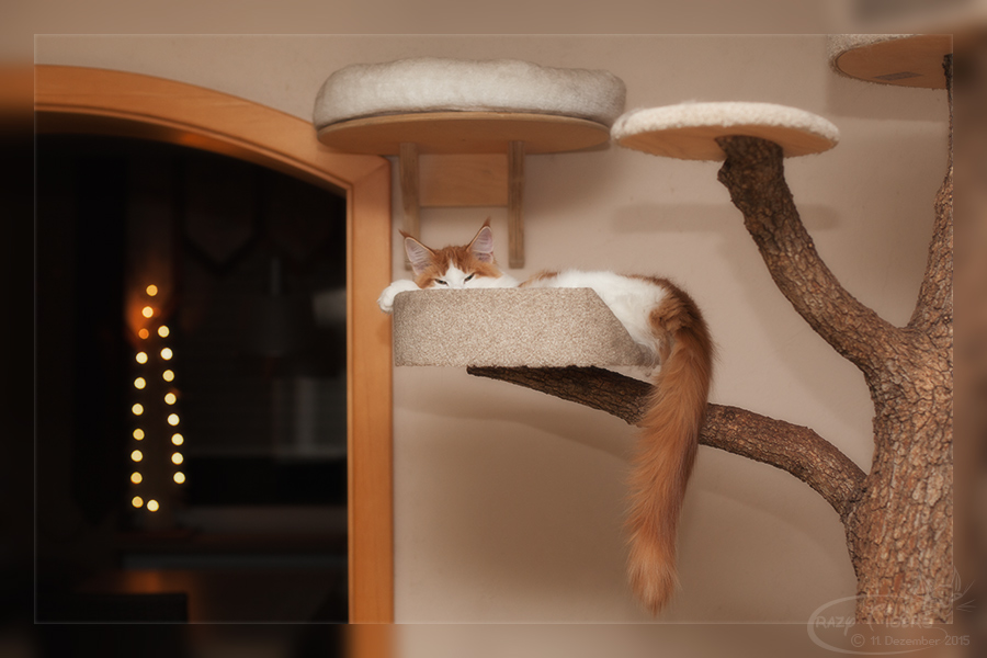 Adriano hält auf den Kratzbaum ein kleines Schläfchen.