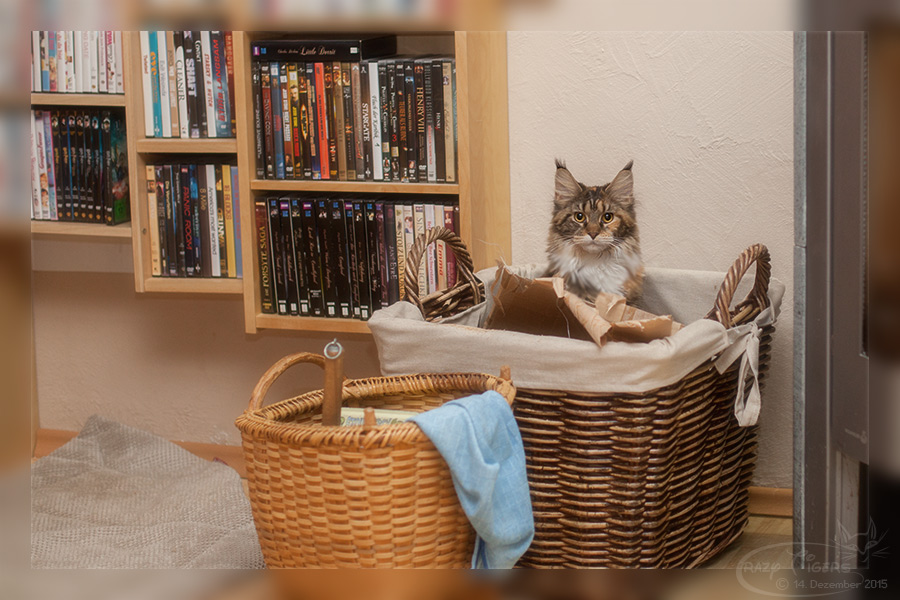 Xantia hat sich den Holzkorb als Versteck ausgesucht.