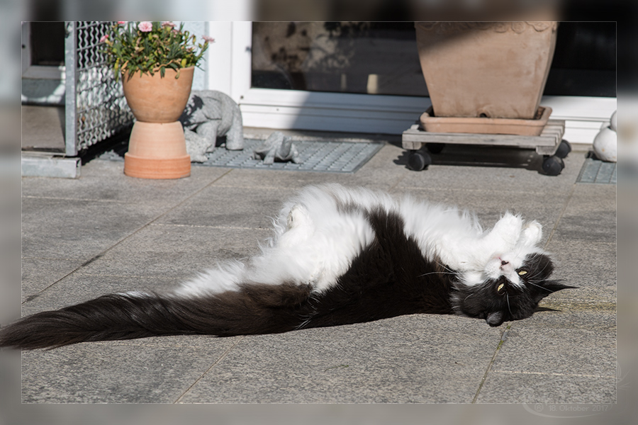 I'Xi nimmt ein Sonnenbad auf der Terrasse.
