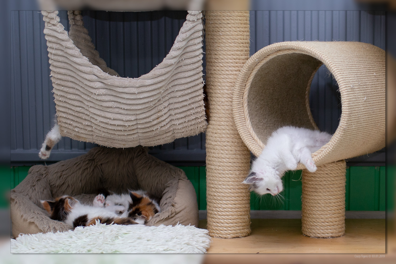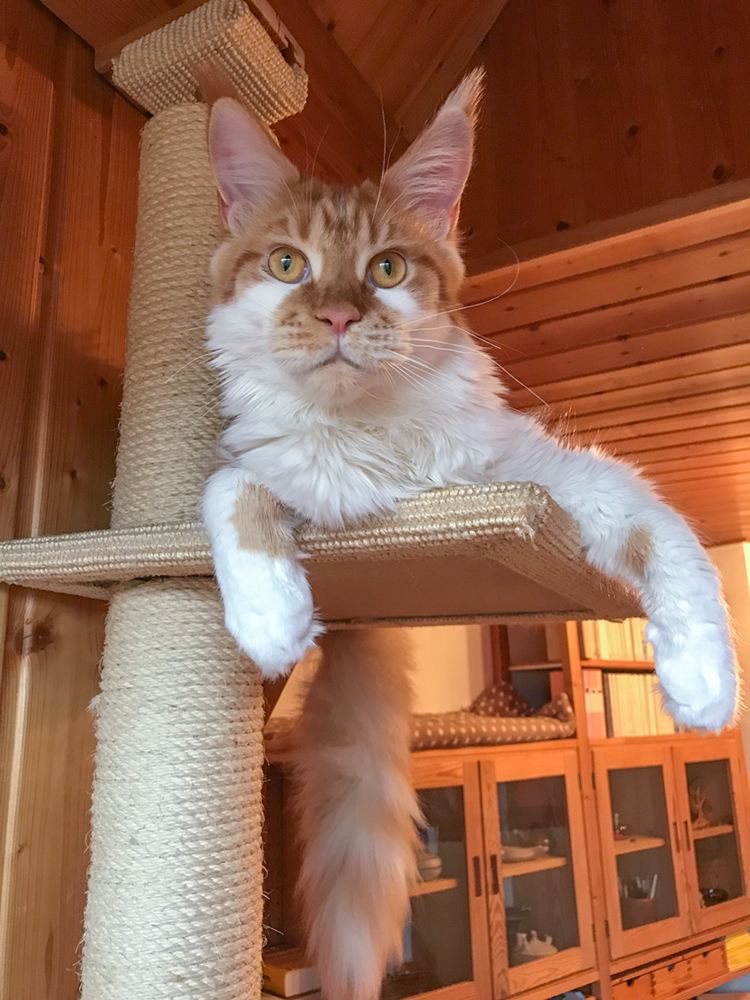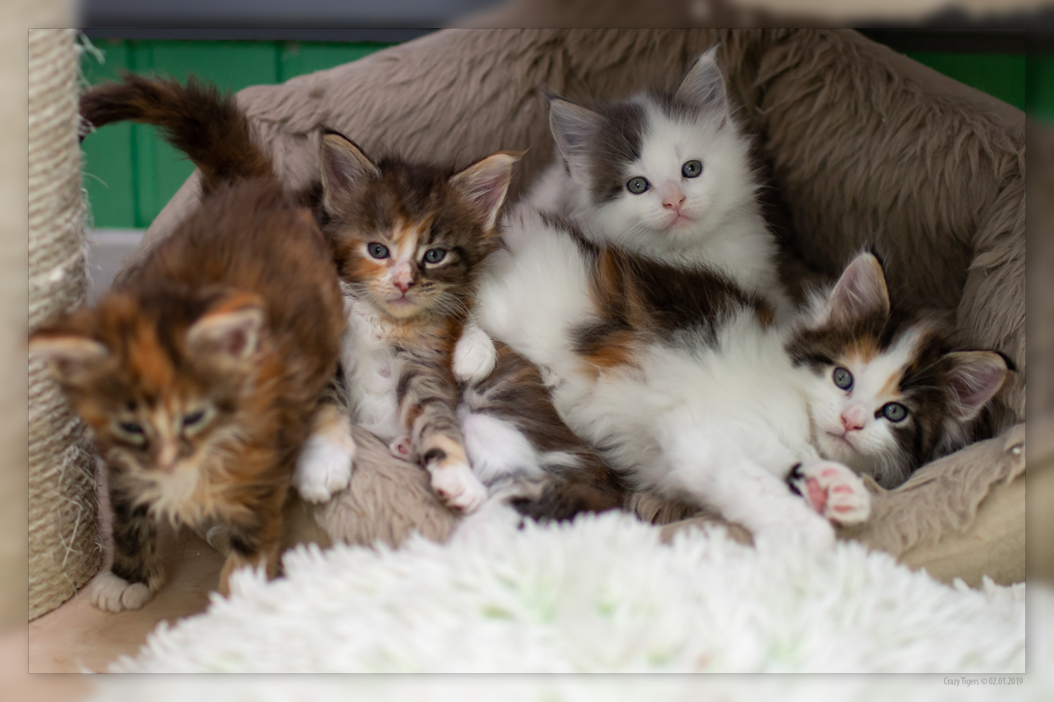 Topa (7 Wochen) schaut sich das "bunte Treiben" der Geschwisterbande von oben an.