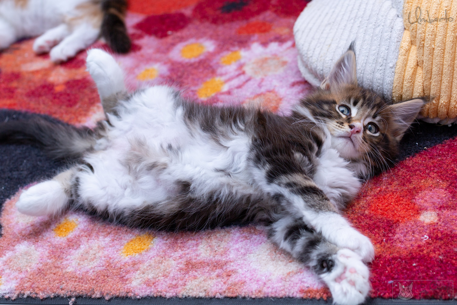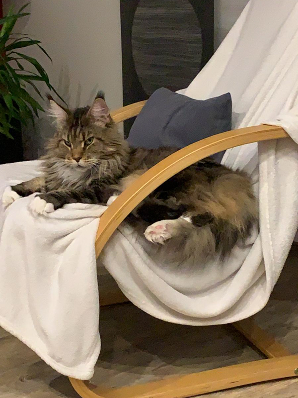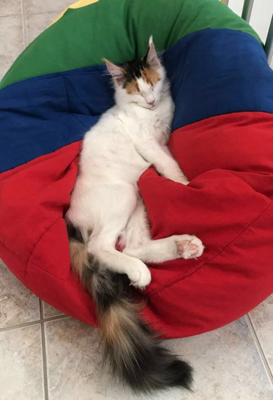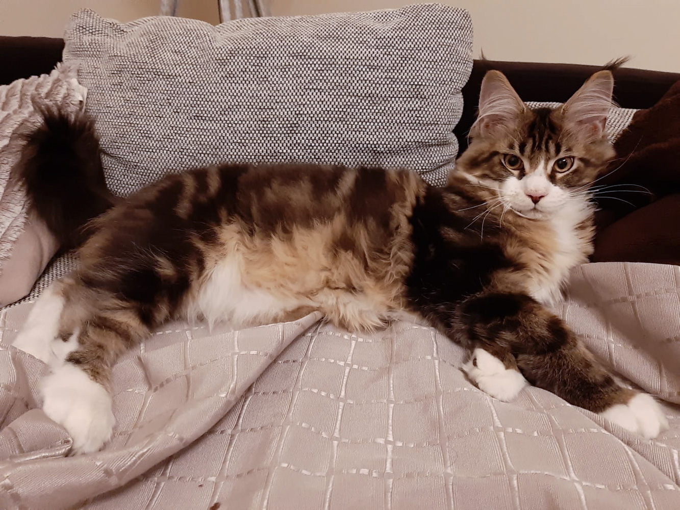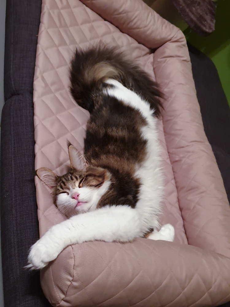 Umani streckt sich auf der Bettdecke.