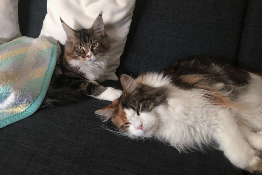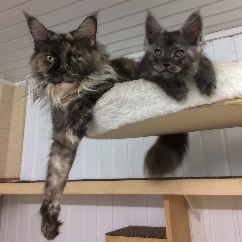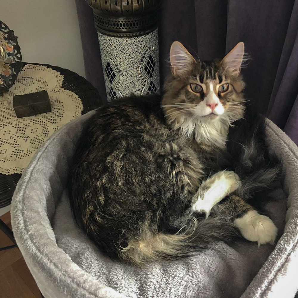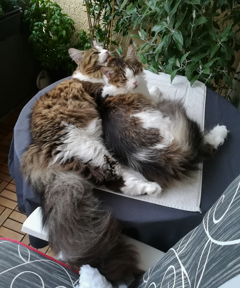 Donna liegt zusammen mit Söhnchen Yason in der Kratzbaumschale.