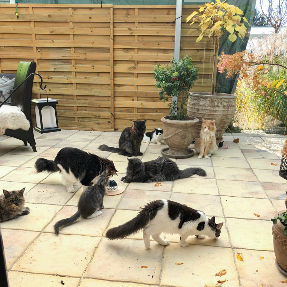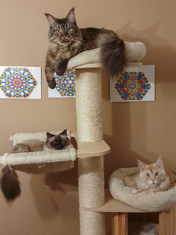 Manuela schickt ein Bild von Zander mit Xara und Katharina schickt ein Bild mit Theo, Yosie und Mimmi zusammen auf dem Kratzbaum.