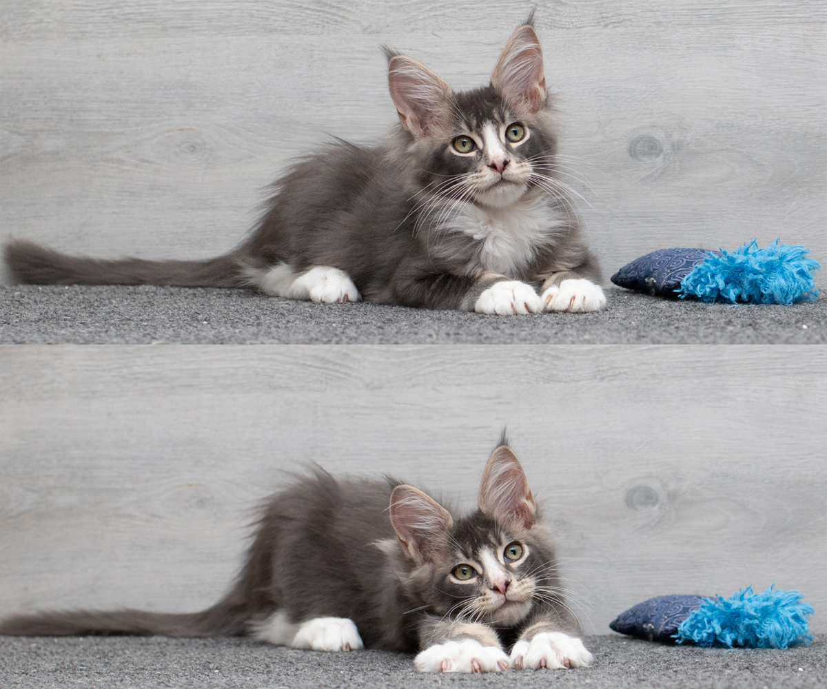 Zwei Bilder von Zitronella mit 14 Wochen - in der Kratzbaumschale und auf dem Tisch.