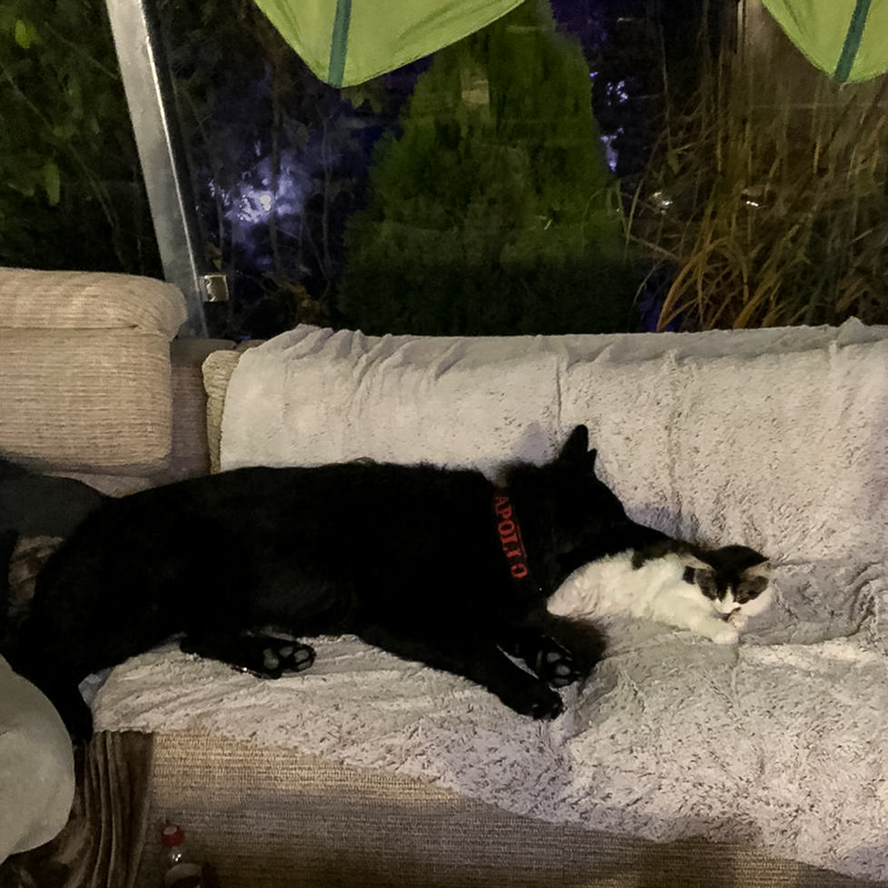 Jermina schickt einen Schnappschuß von Gaston und Pomerol mit ihrer Birma-Freundin.