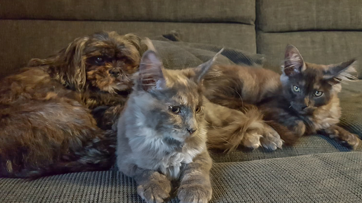 Katharina schickt ein Bild von Theo und Yosie mit ihrer neuen Freundin Lucy zusammengegekuschelt auf der Couch.